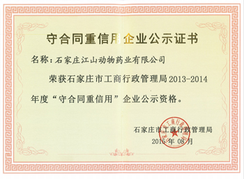 日前,經(jīng)河北省石家莊市工商行政管理局審核批準,江山動物藥業(yè)正式取得2013-2014年度“守合同重信用”企業(yè)公示資格。
